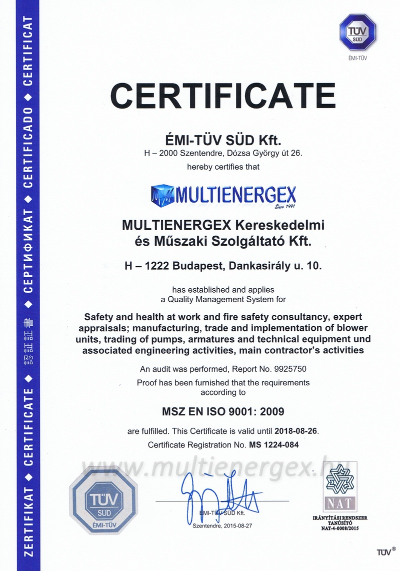 Multienergex Ltd. works in accordance with requirements of MSZ EN ISO 9001 standard.